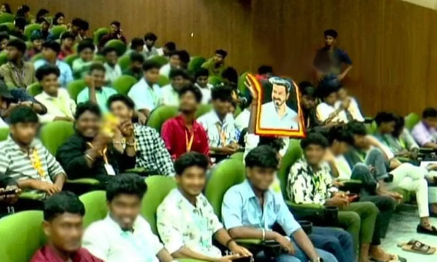 முன்னதாக முதல்-அமைச்சர் மு.க.ஸ்டாலின் பங்கேற்ற நிகழ்ச்சியில், தவெக தலைவர் விஜய் படம் பொறித்த கைக்குட்டையை இளைஞர்கள் சிலர் காட்டியதால் பரபரப்பு ஏற்பட்டது.