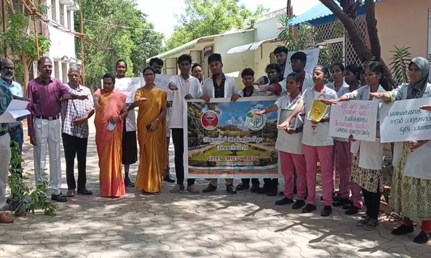 பசுமையைப் பரப்புவோம், புவியைப் பாதுகாப்போம் என்ற முழக்கத்துடன் மருத்துவக் கல்லூரி மாணவர்கள், செவிலியர்கள் உள்ளிட்ட மருத்துவத் துறையினர் அனைவரும் உறுதிமொழி எடுத்துக் கொண்டனர்.;