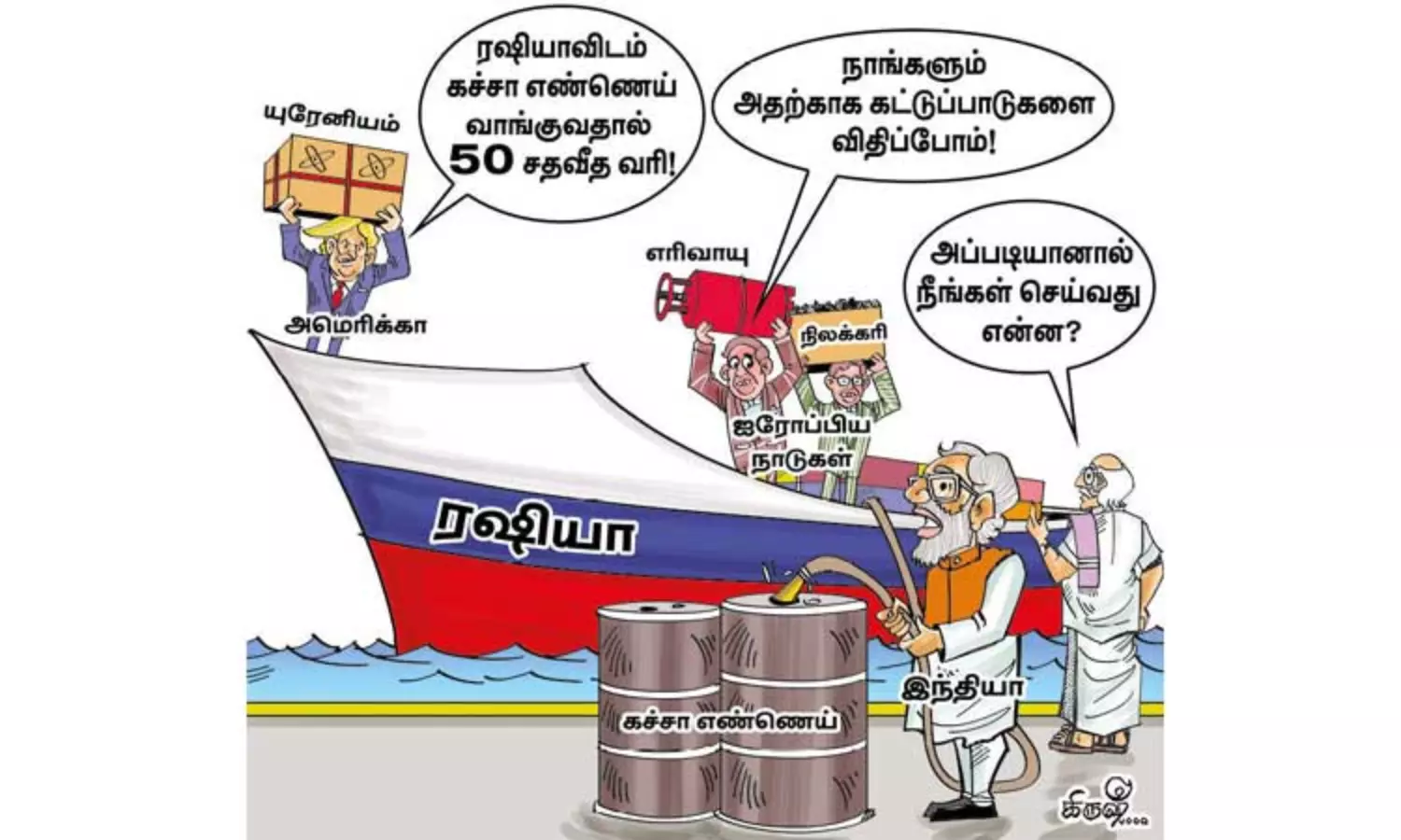 ரஷியாவிடம் இருந்து இந்தியா கச்சா எண்ணெய் வாங்குகிறது. அந்த பணத்தை வைத்து ரஷியா, உக்ரைன் மீது போர் தொடுத்து பல மக்கள் உயிர் இழக்க காரணமாக இருக்கிறது. ரஷிய போர் எந்திரத்துக்கு எரிபொருள் முக்கிய ஆதாரமாக இருக்கிறது. ஆக ரஷியாவிடம் இருந்து இந்தியா கச்சா எண்ணெயை வாங்குவதைத்தான் முக்கிய காரணமாக கூறுகிறது. ரஷியாவிடம் இருந்து இந்தியா கச்சா எண்ணெய் வாங்குவதற்கு காரணம், அங்கு உலக சந்தையைவிட மிகவும் விலை குறைவாக இருக்கிறது. ரஷியாவில் இருந்து கச்சா எண்ணெய் வாங்குவதால் இந்தியாவுக்கு பெரும் லாபம் கிடைக்கிறது. டிரம்ப்பின் கருத்துக்கு ஆதரவு தெரிவிப்பதுபோல ரஷியாவிடம் இருந்து இந்தியா கச்சா எண்ணெய் வாங்கினால் நாங்களும் இந்தியாவுக்கு இறக்குமதியில் பல கட்டுப்பாடுகளை விதிப்போம் என ஐரோப்பிய யூனியனும் கொக்கரிக்கிறது.