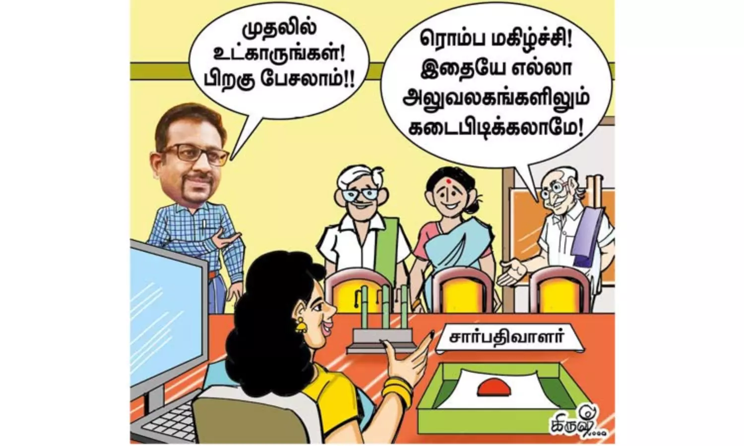 பத்திரப்பதிவு அலுவலகத்துக்கு வரும் பொதுமக்களை நாற்காலியில் உட்கார வைத்துத்தான் சார்பதிவாளர்கள் பேசவேண்டும். எந்த சூழ்நிலையிலும் அவர்களை நிற்க வைத்துக்கொண்டு பேசக்கூடாது. யாரையாவது நிற்க வைத்து பேசியதை உயர் அதிகாரிகள் கண்காணிப்பு கேமராக்களில் பார்த்துக்கொண்டு இருக்கும்போது, கண்டுபிடித்தால் துறை ரீதியாக உரிய நடவடிக்கை எடுக்கப்படும் என அறிவுறுத்தப்பட்டுள்ளது. பதிவுத்துறை அலுவலகங்களுக்கு வரும் பொதுமக்களுக்கு அளிக்கப்படும் இந்த தனி மரியாதை வரவேற்புக்குரியது. இதுபோல அரசு அலுவலகங்களுக்கும் வரும் அனைவரையும் உட்கார வைத்து பேசும் நடைமுறை வந்தால் மிகவும் சிறப்புக்குரியதாக இருக்கும் என்பது பொதுமக்களின் எதிர்பார்ப்பாக இருக்கிறது.