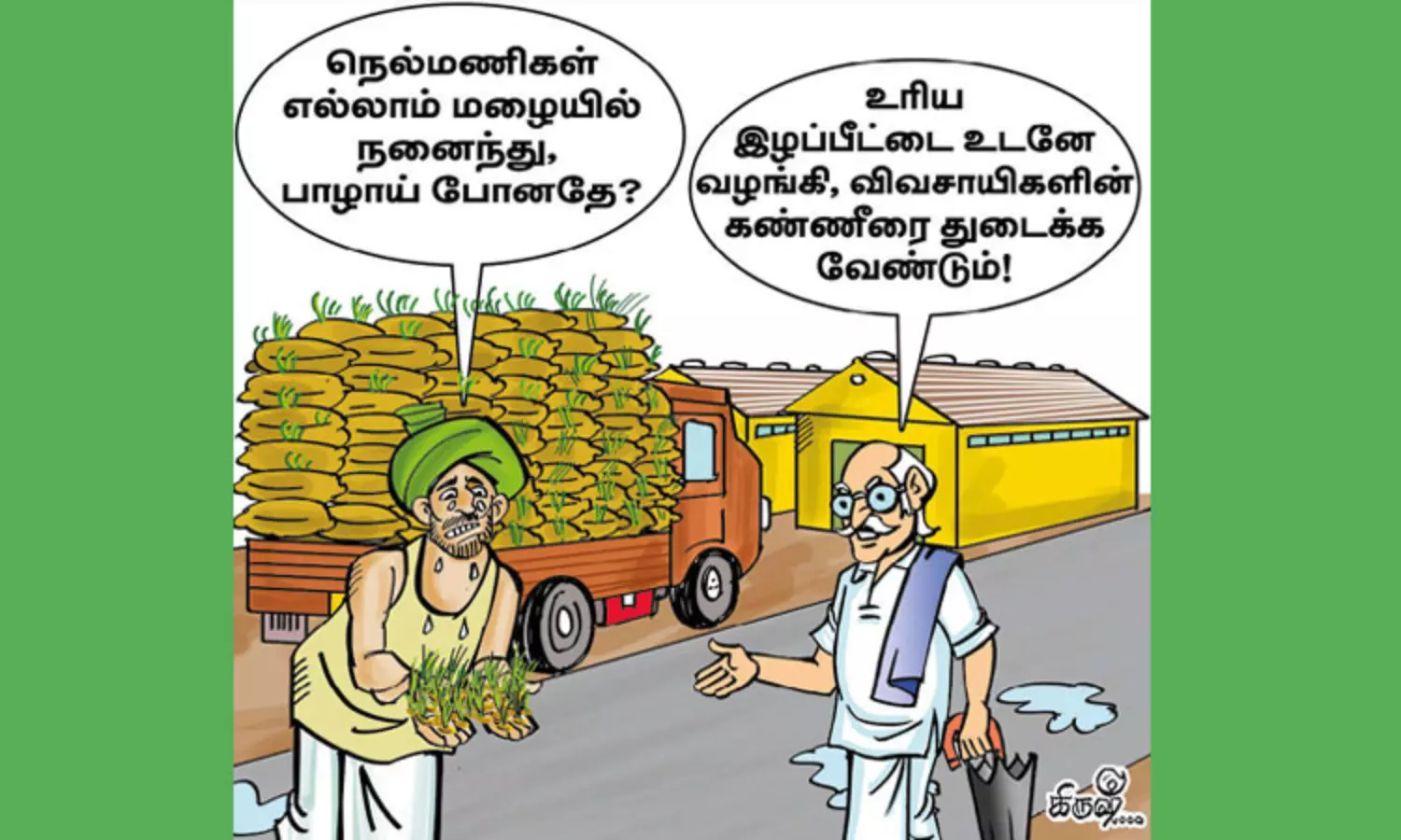 மேலும் நெல் கொள்முதல் நிலையங்களில் 17 சதவீதம் வரை ஈரப்பதம் உள்ள நெல்தான் மத்திய அரசாங்கத்தின் உத்தரவுப்படி வாங்கப்படுகிறது. இப்போது பெய்யும் மழையினால் விவசாயிகளிடம் உள்ள நெல்லின் ஈரப்பதம் அதைவிட அதிகமாக இருக்கிறதால் அவர்களால் நெல்லை விற்க முடியவில்லை. எனவே ஈரப்பதத்தின் அளவை 22 சதவீதமாக உயர்த்தவேண்டும் என்று முதல்-அமைச்சர் மு.க.ஸ்டாலின், மத்திய அரசாங்கத்துக்கு கோரிக்கை விடுத்தார். இதை ஏற்று, நிலைமையை நேரில் பார்வையிட 3 குழுக்களை மத்திய அரசாங்கம் நியமித்துள்ளது. அவர்கள் இன்று தங்கள் பணியினை தொடங்குகிறார்கள். இதுதவிர நெல் கொள்முதல் நிலையங்களில் மழையில் நனைந்து முளைவிட்ட நெல் மூட்டைகளுக்கும், வயலில் மழையால் மூழ்கிய நெற்பயிர்களுக்கும் உரிய இழப்பீடை அரசோ, காப்பீட்டு நிறுவனங்களோ வழங்கி விவசாயிகளின் கண்ணீரை துடைக்க வேண்டும்.