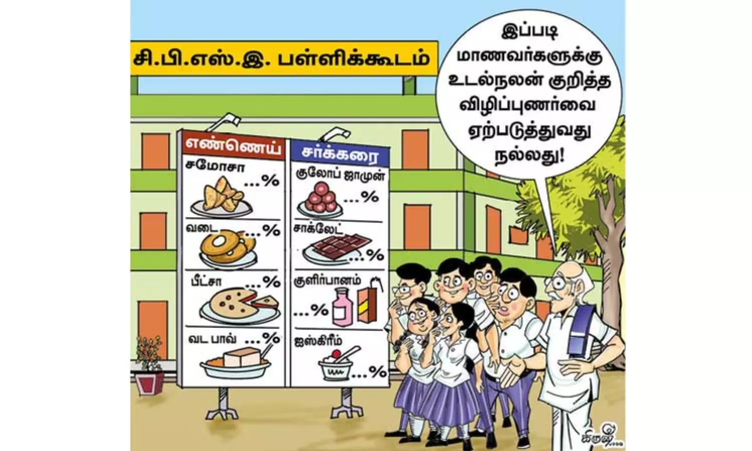 ஆரோக்கியமாக வாழ நாம் சாப்பிடும் உணவு வகைகளில் அளவுக்கு அதிகமான எண்ணெய், சர்க்கரை இருப்பதை தெரிவிக்கவேண்டும் என்று விழிப்புணர்வை ஏற்படுத்துவது பலனளிப்பதாகும். இந்த நடைமுறையின் நல்ல விளைவுகளைப்பார்த்து தமிழக கல்வி திட்டத்தை பின்பற்றும் பள்ளிக்கூடங்களிலும் செயல்படுத்தினால் வரவேற்புக்குரியதாக இருக்கும்.
