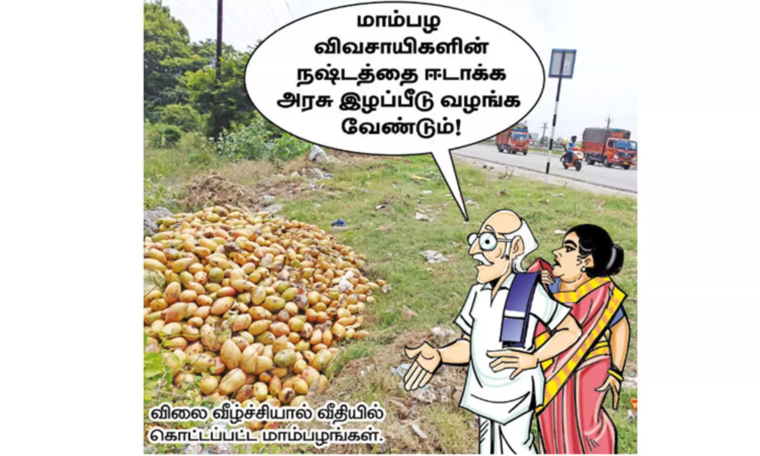 இதுபோல மத்திய அரசாங்கம் விலை வீழ்ச்சி பட்டுவாடா திட்டத்தின் கீழ் கர்நாடக விவசாயிகளுக்கு குவிண்டாலுக்கு ரூ.1,616 வீதம் அதிகபட்சமாக 2½ லட்சம் டன் மாம்பழத்துக்கு இழப்பீடு வழங்கப்படும் என்று அறிவித்துள்ளது. முதல்-அமைச்சர் மு.க.ஸ்டாலினும் பிரதமருக்கு கடிதம் எழுதியுள்ளார். அதில், மத்திய அரசின் சந்தை தலையீட்டு திட்டத்தில் தற்போதுள்ள மாம்பழ விற்பனை விலைக்கும், சந்தை தலையீட்டு விலைக்கும் உள்ள வித்தியாசத்தை நேரடியாக விவசாயிகளுக்கு இழப்பீடாக வழங்கவேண்டும் என்றும், மத்திய கொள்முதல் நிலையங்கள் மூலம் தமிழக விவசாயிகளின் மாம்பழங்களை நியாயமான விலையில் கொள்முதல் செய்யவேண்டும் என்றும் கேட்டுக்கொண்டுள்ளார். மேலும் மாம்பழ கூழ்-க்கான ஜி.எஸ்.டி.யை 12 சதவீதத்தில் இருந்து 5 சதவீதமாக குறைக்கவும் வலியுறுத்தியுள்ளார். அதேநேரத்தில் தமிழக அரசும் ஆங்காங்கு மாம்பழ கூழ் தயாரிக்கும் தொழிற்சாலையை தொடங்கி விவசாயிகளிடம் இருந்து நல்ல விலையில் மாம்பழங்களை கொள்முதல் செய்யவேண்டும். நஷ்டத்தை ஈடாக்க இப்போது இழப்பீடு வழங்கவேண்டும் என்பதே விவசாயிகளின் கோரிக்கை.