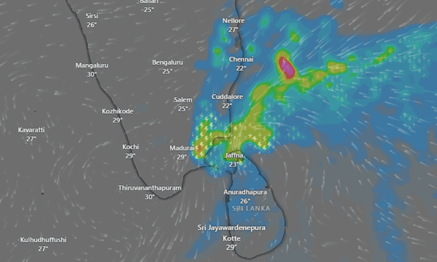 தென்மேற்கு வங்கக்கடல் மற்றும் பூமத்திய ரேகையை ஒட்டிய இந்திய பெருங்கடல் பகுதியில் நிலவிய ஆழ்ந்த காற்றழுத்த தாழ்வு மண்டலம், இலங்கையை நோக்கி நகர்ந்து வருகிறது. சென்னைக்கு தெற்கு தென்கிழக்கில், 490 கி.மீ., தொலைவில் உள்ளது. இந்த ஆழ்ந்த காற்றழுத்த தாழ்வு மண்டலமானது தற்போது காற்றழுத்த தாழ்வு மண்டலமாக வலுவிழந்துள்ளது.