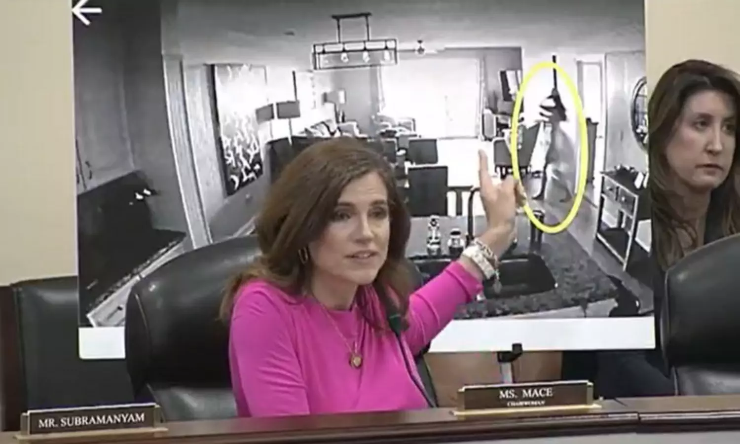 இந்த புகார் தொடர்பாக அமெரிக்க நாடாளுமன்ற மேற்பார்வைக் குழு கூட்டத்தில் விசாரணை நடைபெற்றது. அப்போது நான்சி மேஸ் தனது நிர்வாண புகைப்படத்தை ஆதாரமாக காட்டினார். அந்த புகைப்படம் சி.சி.டி.வி. கேமராவில் பதிவான காட்சியில் இருந்து எடுக்கப்பட்டிருந்தது. தனது முன்னாள் காதலர் வீட்டில் ரகசியமாக சி.சி.டி.வி. கேமராவை வைத்து தன்னை நிர்வாணமாக படமெடுத்துள்ளார் என்று நான்சி மேஸ் தெரிவித்தார்.