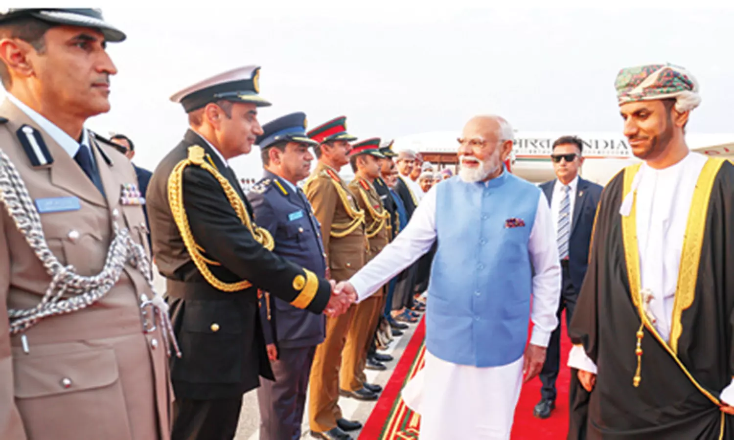 ஓமன் தலைநகர் மஸ்கட்டுக்கு சென்றடைந்த பிரதமர் மோடிக்கு விமான நிலையத்தில் சிவப்பு கம்பள வரவேற்பு அளிக்கப்பட்டது.;