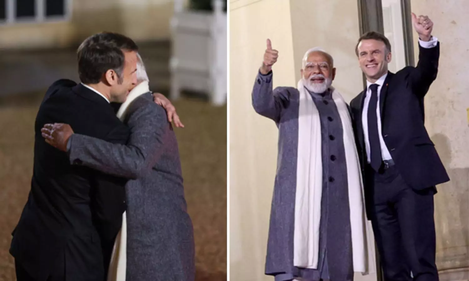 விருந்து நிகழ்வில் பிரதமர் மோடியை பிரான்ஸ் அதிபர் இம்மானுவேல் மேக்ரான் கட்டித்தழுவி வரவேற்றார்.;