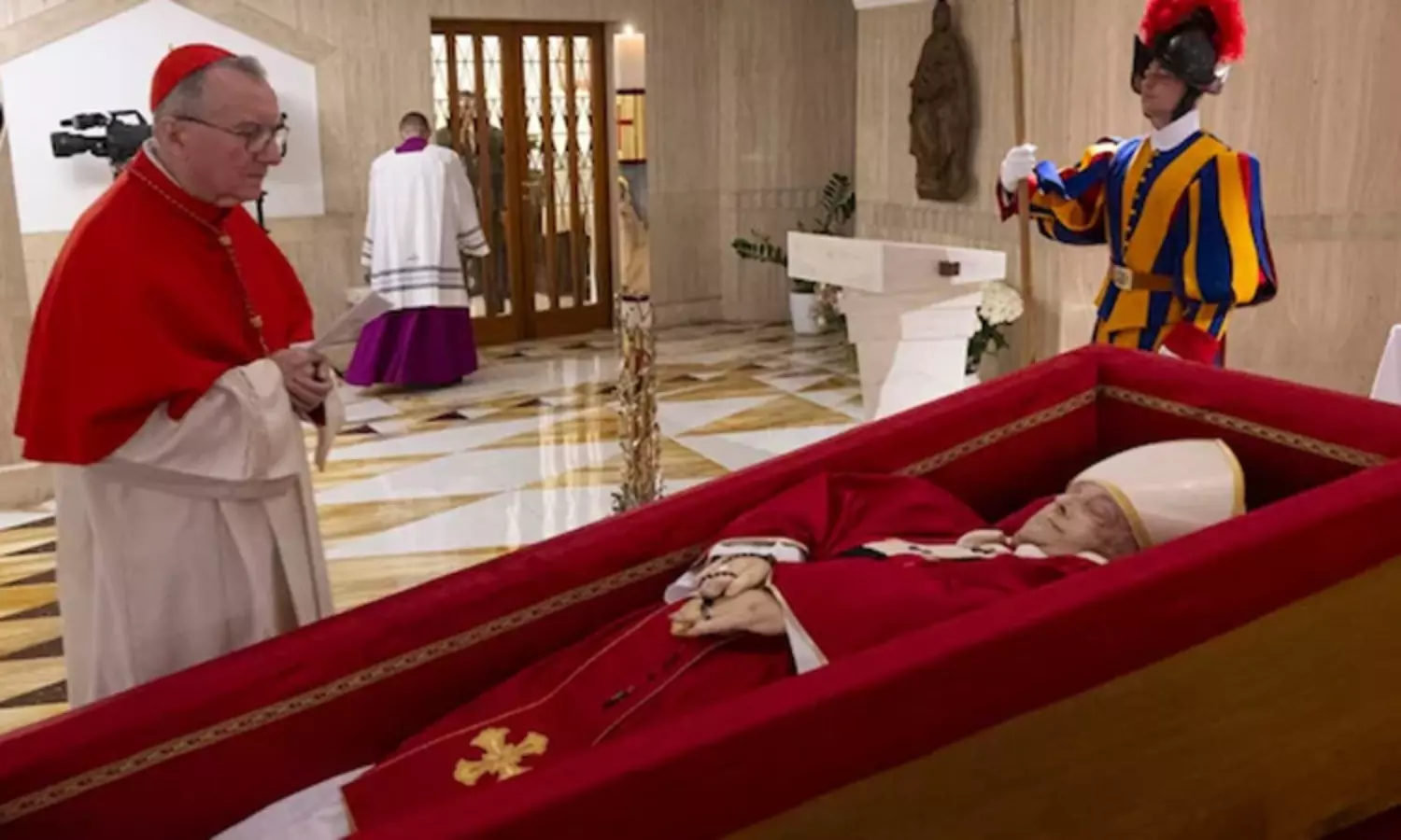 இதற்கிடையே இறப்பிற்குப் பிறகு போப் பிரான்சிஸின் படங்களை வாடிகன் வெளியிட்டுள்ளது. சிவப்பு அங்கிகளுடன், பிஷப் ஆடை போப் பிரான்சிஸுக்கு அணிவிக்கப்பட்டுள்ளது. போப் பிரான்சிஸ் உடல் அவர் வசித்த சாண்டா மார்டா இல்லத்தில் உடல் வைக்கப்பட்டுள்ளது.
