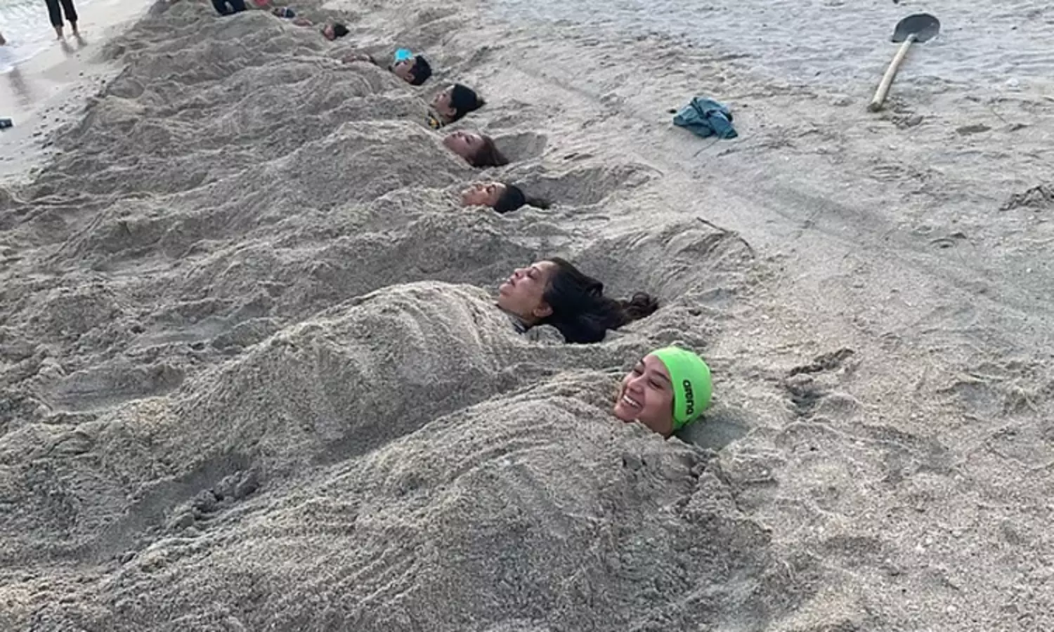 அதிகாலை 5.30 மணி முதல் 6.30 மணி வரை ஈரமான மணலில் சுமார் 25 நிமிடங்கள் புதைந்திருக்கின்றனர்.