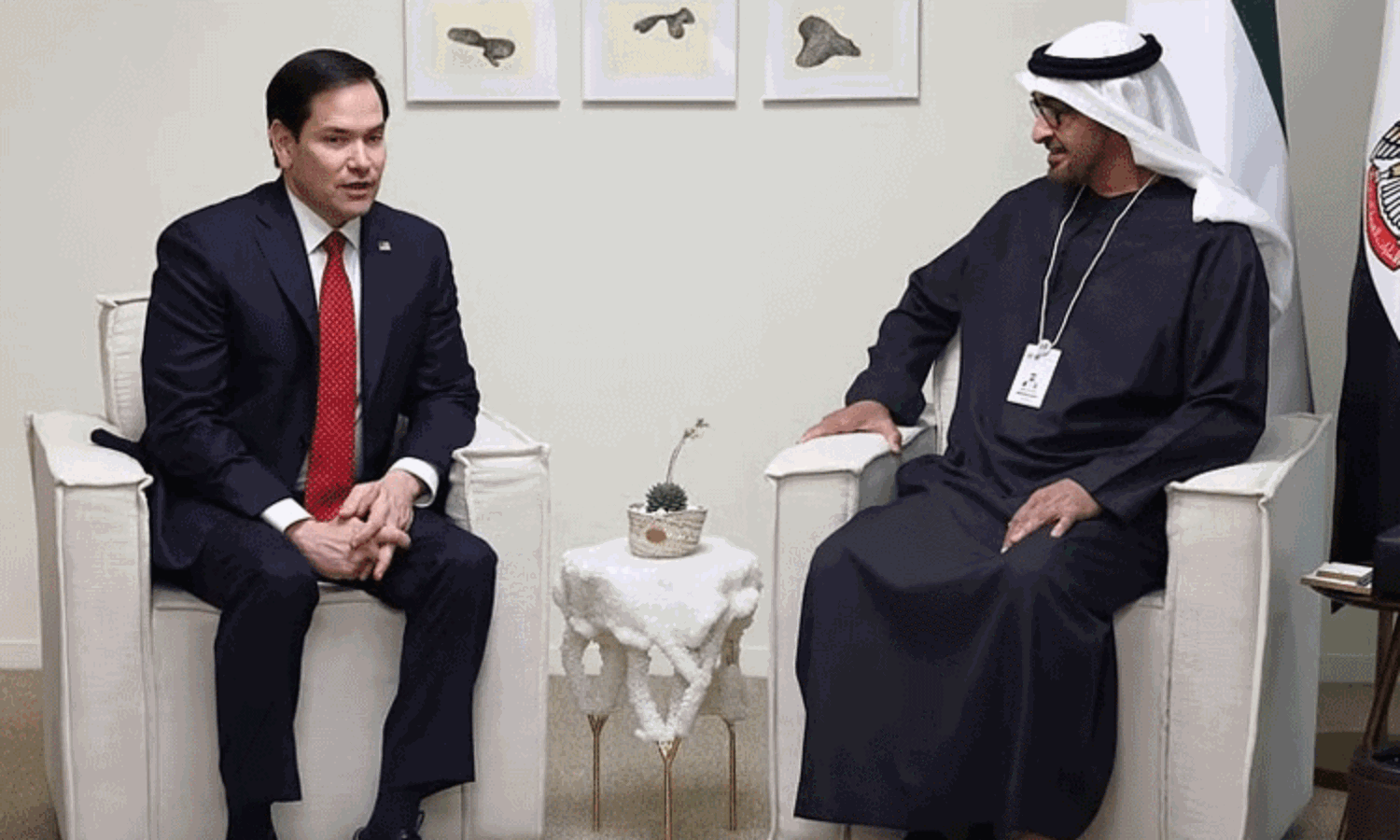 தொடர்ந்து மார்கோ ரூபியோ அபுதாபி தேசிய கண்காட்சி மையத்தில் நடக்கும் ஐடெக்ஸ் சர்வதேச பாதுகாப்பு கண்காட்சி வளாகத்திற்கு சென்றார். அப்போது அங்கு பார்வையிட வருகை புரிந்திருந்த அமீரக அதிபர் மேதகு ஷேக் முகம்மது பின் ஜாயித் அல் நஹ்யானை சந்தித்து பேசினார்.