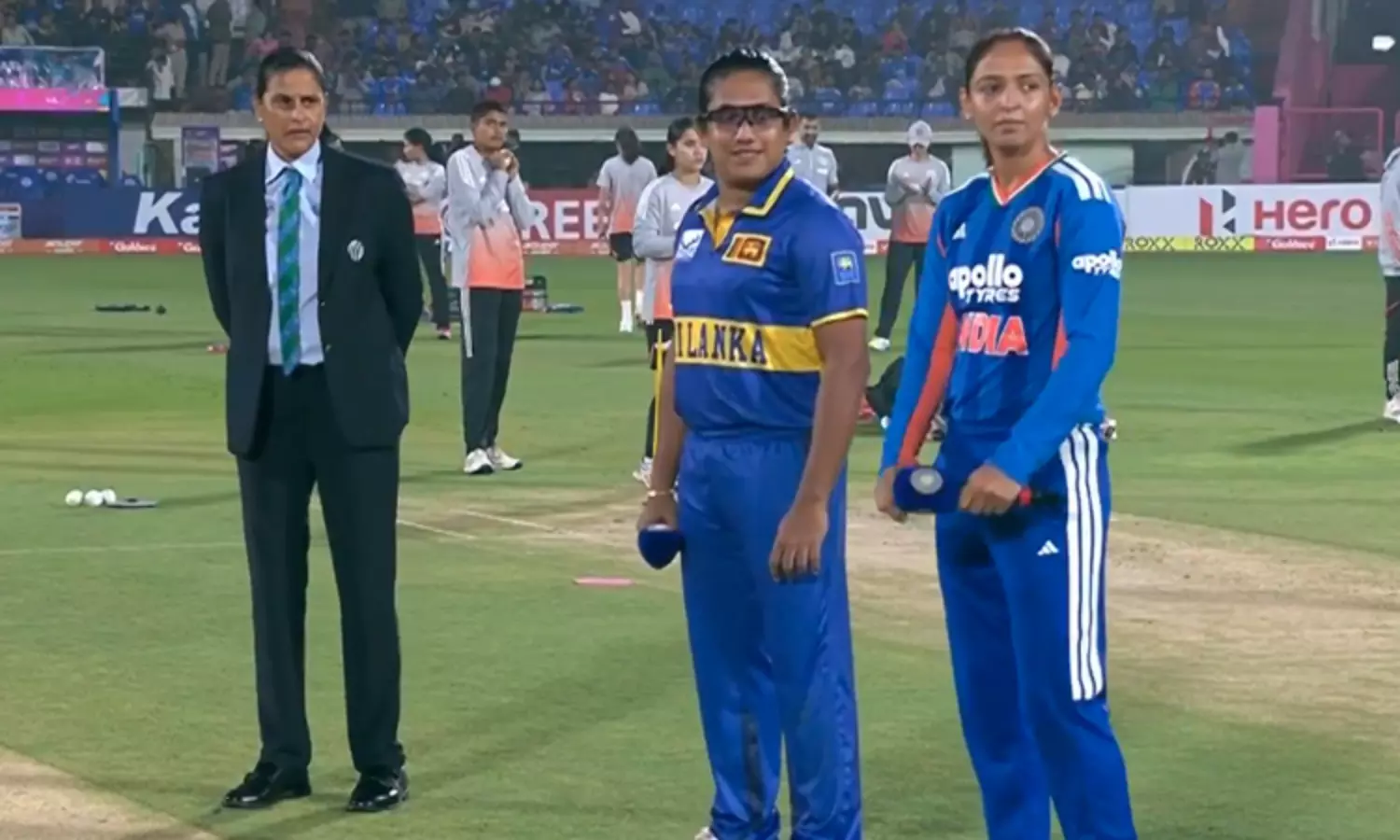 இந்த போட்டிக்கான டாஸ் போடப்பட்டது. அதில் டாஸ் வென்ற இந்திய அணியின் கேப்டன் ஹர்மன்பிரீத் கவுர் பந்துவீச்சை தேர்வு செய்தார். அதன்படி இலங்கை அணி முதலில் பேட்டிங் செய்கிறது.