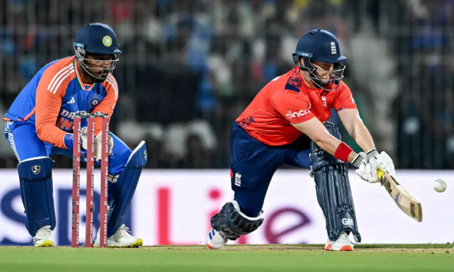 அந்த அணியின் தொடக்க வீரர்களாக பிலிப் சால்ட் மற்றும் பென் டக்கெட் களமிறங்கினர். இதில் பிலிப் சால்ட் 5 ரன்களில் அவுட் ஆகி வெளியேறினார். அரை சதம் கடந்த பென் டக்கெட் 51 ரன்களில் ஆட்டமிழந்தார். கேப்டன் ஜாஸ் பட்லர் 24 ரன்களும், லியாம் லிவிங்ஸ்டன் 43 ரன்களும் எடுத்தனர்.
