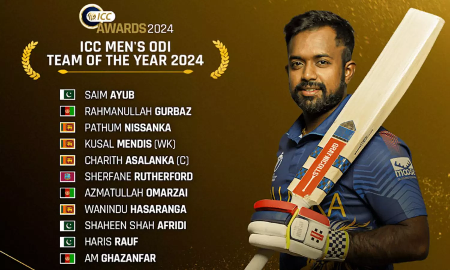 2024ம் ஆண்டின் சிறந்த ஒருநாள் ஆண்கள் அணி விவரம்: சைம் அயூப் (பாகிஸ்தான்), ரஹ்மனுல்லா குர்பாஸ் (ஆப்கானிஸ்தான்) பதும் நிசாங்கா (இலங்கை), குசல் மெண்டிஸ் (விக்கெட் கீப்பர், இலங்கை), சரித் அசலங்கா (கேப்டன், இலங்கை), ஷெர்பேன் ரூதர்போர்டு (வெஸ்ட் இண்டீஸ்), அஸ்மத்துல்லா ஓமர்சாய் (ஆப்கானிஸ்தான்), வனிந்து ஹசரங்கா (இலங்கை), ஷாகின் ஷா அப்ரிடி (பாகிஸ்தான்), ஹாரிஸ் ரவூப் (பாகிஸ்தான்), அல்லா கசன்பர் (ஆப்கானிஸ்தான்).