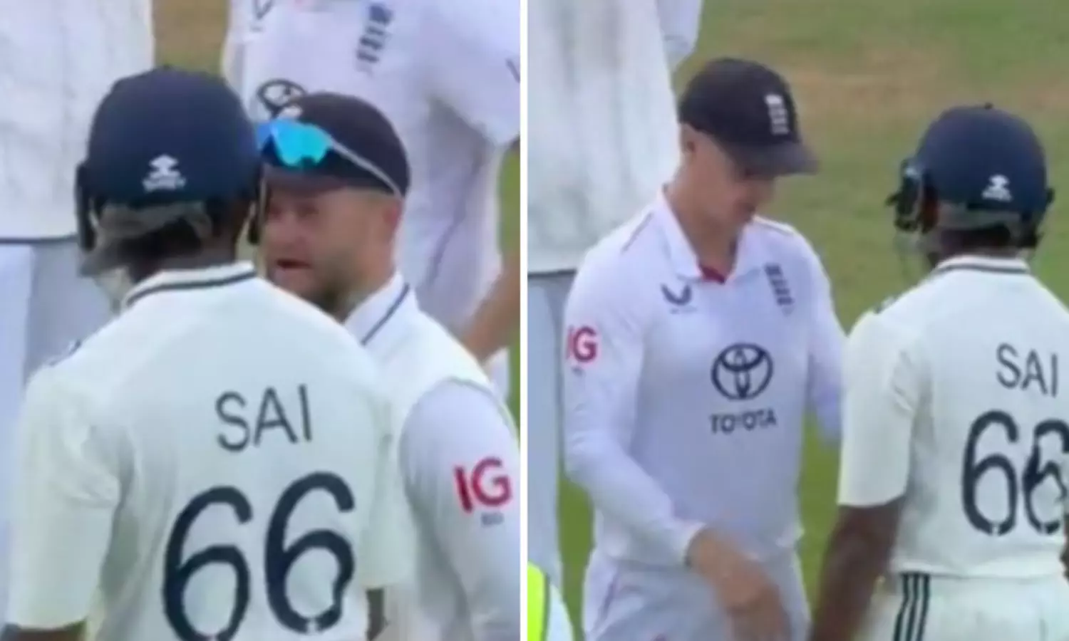 இந்நிலையில் சாய் ஆட்டமிழந்து பெவிலியன் திரும்பியபோது பென் டக்கெட் அவரை நோக்கி ஏதோ கூறி வம்பிழுத்துள்ளார். இதனால் கடுப்படைந்த சாய் சுதர்சன் திரும்பி வந்து பென் டக்கெட் உடன் வார்த்தை மோதலில் ஈடுபட்டார். இருவருக்கும் இடையே ஏற்பட்ட காரசாரமான வாக்குவாதம் மைதானத்தில் சலசலப்பை ஏற்படுத்தியது. ஹாரி புரூக் மற்றும் இங்கிலாந்து கேப்டன் ஆலி போப் இணைந்து சாய் சுதர்சனை சமாதானம் செய்து அனுப்பி வைத்தனர்.