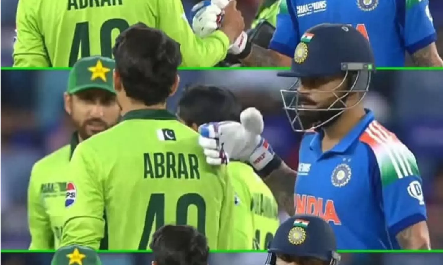 இந்த போட்டியில் பாகிஸ்தான் இளம் வீரர் அப்ரார் அகமது 10 ஓவர்கள் வீசி வெறும் 28 ரன்கள் மட்டுமே விட்டுக்கொடுத்ததுடன் சுப்மன் கில்லின் விக்கெட்டையும் கைப்பற்றினார். இதனால் அவரை விராட் கோலி களத்திலேயே பாராட்டினார்.