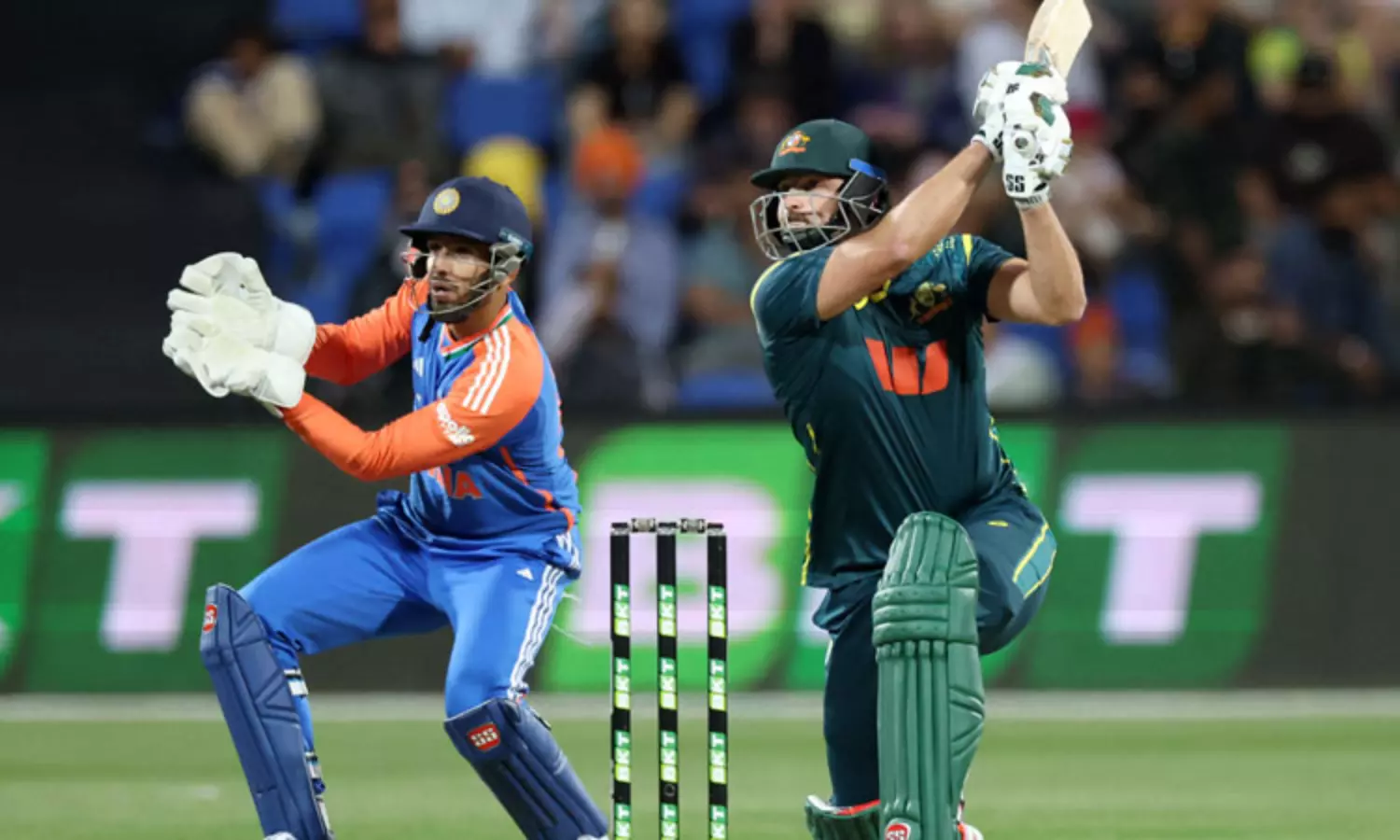 இந்தியாவுக்கு எதிரான 3-வது டி20 போட்டியில் டிம் டேவிட் அடித்த சிக்சர் ஒன்று 129மீ தூரம் சென்றது.;