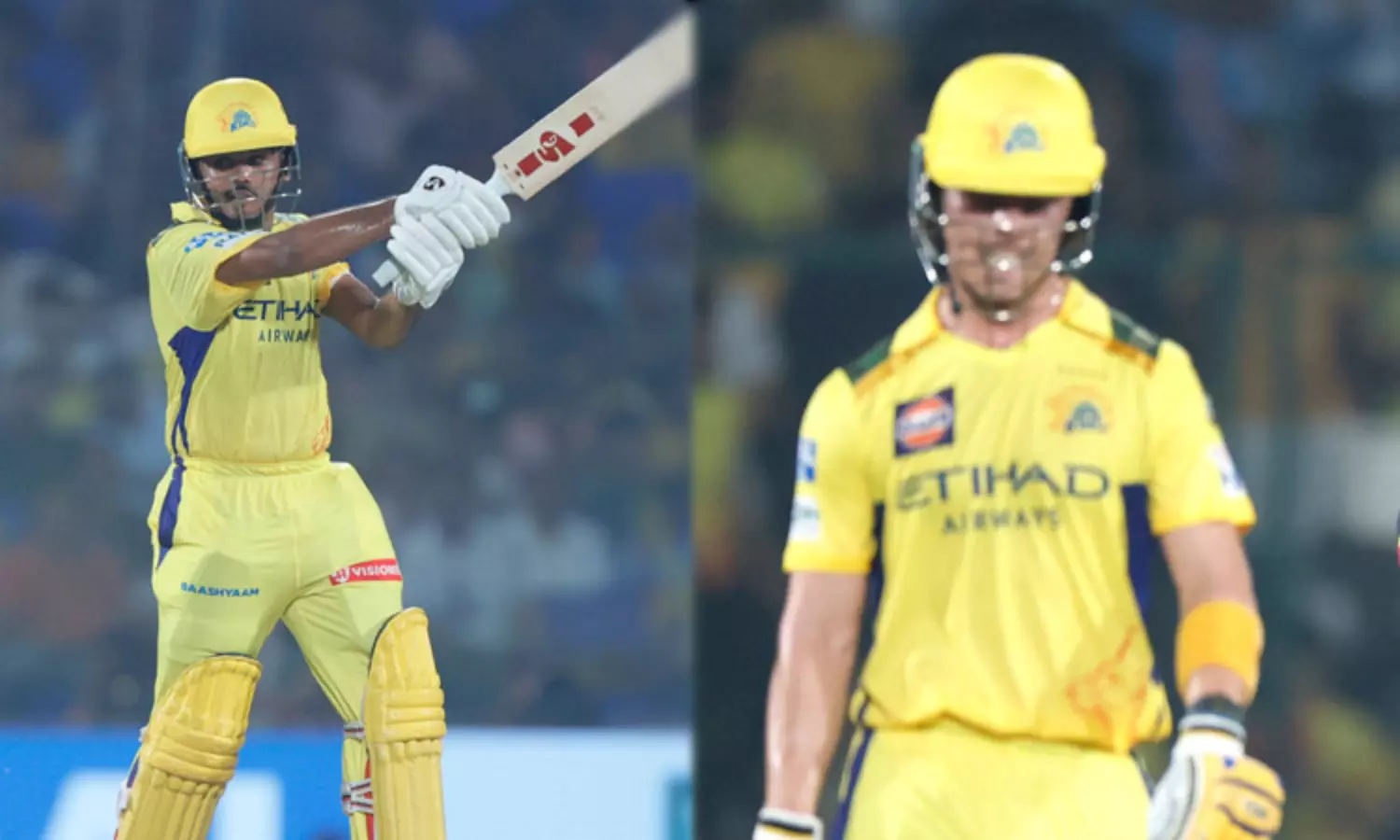 இதில் கான்வே 10 ரன்னிலும் அடுத்து வந்த அஸ்வின் 13 ரன்னிலும், ஜடேஜா 1 ரன்னிலும், உர்வில் படேல் ரன் எடுக்காமலும் அடுத்தடுத்து அவுட் ஆகினர். மறுபுறம் அதிரடியாக ஆடிய ஆயுஷ் மாத்ரே 20 பந்தில் 43 ரன் எடுத்து அவுட் ஆனார். தொடர்ந்து பிரெவிஸ் மற்றும் ஷிவம் துபே ஜோடி சேர்ந்தனர். இதில் பிரெவிஸ் அதிரடி ஆட்டத்தை வெளிப்படுத்தினார்.