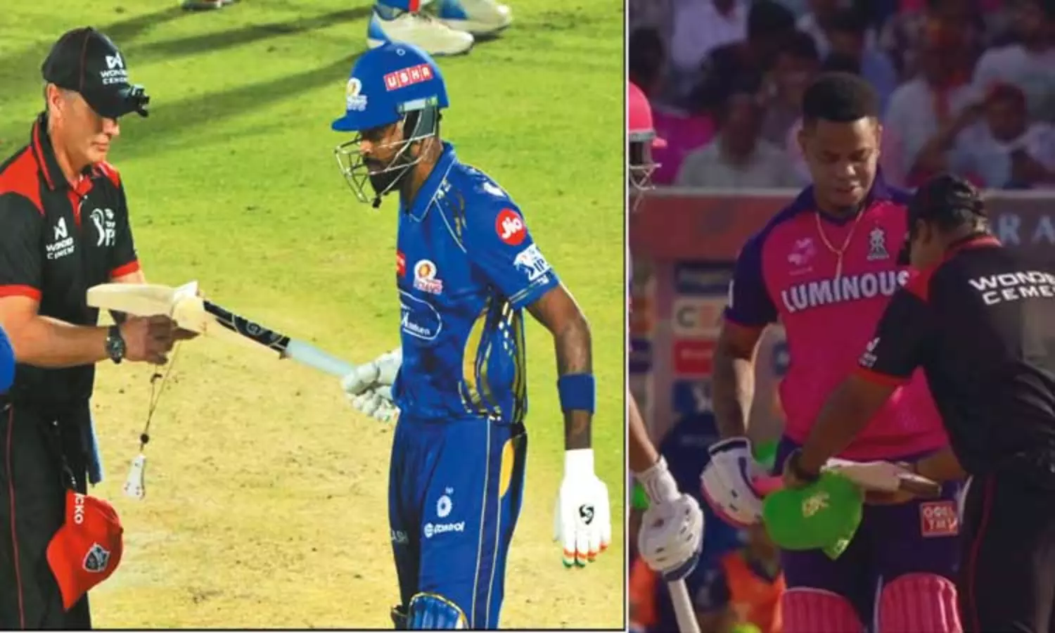 ஐ.பி.எல். கிரிக்கெட் தொடரில் நேற்று நடைபெற்ற ஆட்டங்களில் ராஜஸ்தான் ராயல்ஸ் - ராயல் சேலஞ்சர்ஸ் பெங்களூரு, (மாலை) மற்றும் மும்பை இந்தியன்ஸ் - டெல்லி கேப்பிடல்ஸ் (இரவு) அணிகள் மோதின. இதில் பெங்களூரு மற்றும் மும்பை அணிகள் வெற்றி பெற்றன. இந்த ஆட்டங்களின்போது வழக்கத்திற்கு மாறாக நடுவர்கள் திடீரென வீரர்கள் பயன்படுத்திய பேட்டை சோதனை செய்தனர்.