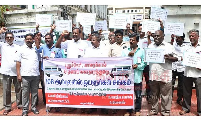புதுச்சேரி, காரைக்கால் மற்றும் ஏனாமில் 108 ஆம்புலன்ஸ் டிரைவர்கள் சங்கத்தினர் பணி நிரந்தரம் வழங்க வேண்டும். பணிநிரந்தரம் செய்யும் வரை புதுவை அரசு டிரைவர்களுக்கு இணையாக சம்பளம் வழங்க வேண்டும். மாதத்தில் முதல் நாள் சம்பளம் வழங்க வேண்டும். ஆம்புலன்சுகளில் உதவியாளர்களை நியமிக்க வேண்டும். மருத்துவ விடுப்பு உள்ளிட்டவை வழங்கக்கோரி தொடர் போராட்டத்தில் ஈடுபடுவதாக அறிவித்து இருந்தனர்.