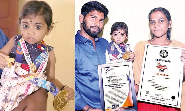 அந்த குழந்தையின் பெயர் சாய் ஈஷா. தந்தை சக்தீந்திரன், தாய் முத்தம்மாள். புலியூர்குறிச்சி கிராமத்தில் வசிக்கிறார்கள். சக்தீந்திரன் டயர் பஞ்சர் பார்க்கும் கடை நடத்தி வருகிறார். இல்லத்தரசியான முத்தம்மாள் ஆசிரியை பயிற்சி முடித்து விட்டு, வீட்டில் இருந்தபடியே பி.ஏ. படித்து வருகிறார். 120 பொருட்கள் மற்றும் காட்சிகளை சரியாக அடையாளம் காட்டும் புத்திக் கூர்மை தான் இவர்களின் மகளான சாய் ஈஷாவை சாதனை புத்தகத்தில் இடம் பிடிக்க வைத்துள்ளது. குழந்தையின் திறமை பற்றி தாயார் முத்தம்மாள் பகிர்ந்து கொண்டவை...