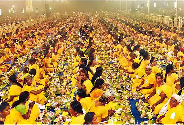தஞ்சை மாவட்டம் பட்டுக்கோட்டையை அடுத்த கார்காவயல் கிராமத்தில் ஆதி சிவசக்தி சித்தர் ஞானபீடம் உள்ளது. இங்கு 10 ஆயிரத்து 8 பெண்கள் கலந்து கொள்ளும் வகையில் சிறப்பு திருவிளக்கு பூஜை செய்து உலக கின்னஸ் சாதனை நிகழ்ச்சியாக நடத்த ஏற்பாடு செய்யப்பட்டிருந்தது. அதன்படி நேற்று முன்தினம் பிற்பகல் பட்டுக்கோட்டை வெங்கிடுசுப்பையா சுவாமிகள் ஆலயத்தில் இருந்து ருத்ர சித்தர் தலைமையில் முக்கிய வீதிகள் வழியாக நாடியம்மன் கோவில் வரை யானை, ஒட்டகம் மற்றும் கலை நிகழ்ச்சிகளுடன் இந்து சக்தி ஊர்வலம் நடைபெற்றது. இதில் ஏராளமான ஆண்களும், பெண்களும் கலந்து கொண்டனர்.