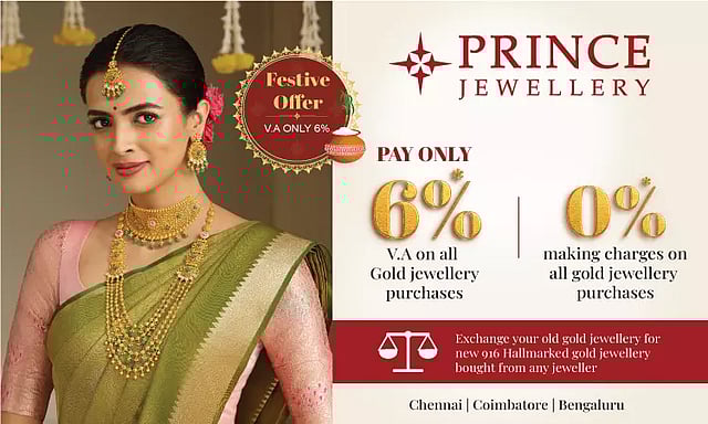 தென்னிந்திய அளவில் ஜுவல்லரியில் நம்பகமான பெயரை பெற்றுள்ள பிரின்ஸ் ஜுவல்லரி இந்த பொங்கல் விழா காலத்தில் வாடிக்கையாளர்களுக்கு சிறப்பு சலுகையை அறிவித்துள்ளது. இந்த தைப்பொங்கல் கொண்டாட்டங்கள் வாடிக்கையாளர்கள் மனதில் என்றும் நீங்காமல் இருக்கும் வகையில், அனைத்து தங்க நகைகள் வாங்கும் பொழுதும் அதன் மொத்த மதிப்பில் 6 சதவீதம் செய்கூலி மதிப்பு மட்டுமே (Value Addition - V.A) கணக்கிடப்படுகிறது. அத்துடன் சில குறிப்பிட்ட வகை நகைகளுக்கு செய்கூலி மற்றும் சேதாரம் ஆகியவை தள்ளுபடி செய்யப்படுகிறது.