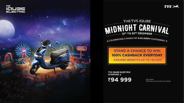 டி.வி.எஸ். ஐகியூப் நள்ளிரவு திருவிழா கடந்த 12-ந் தேதி தொடங்கியது. டி.வி.எஸ். ஐகியூப் 4.50 லட்சம் வாடிக்கையாளர்களை பிடித்து அதன் இலக்கை எட்டியுள்ளது. இதையொட்டி தான் இந்த திருவிழா அறிவிக்கப்பட்டது. டி.வி.எஸ். ஐகியூப் வாங்க விரும்புவோரின் மாலைப்பொழுதை மறக்க முடியாத நாளாக கொண்டாட இதுதான் நேரம். ஏனெனில் இந்தியாவில் உள்ள ஒவ்வொரு குடும்பத்துக்கும் ஏற்ற வகையில் டி.வி.எஸ். ஐகியூப் மின்சார ஸ்கூட்டர் வடிவமைக்கப்பட்டுள்ளது. அதிநவீன வசதிகளுடன் எளிதாக இயக்கவும், பயணிக்க இதமாகவும் இருக்கும் வகையில் வடிவமைக்கப்பட்டுள்ளது. இதன் விலை ரூ.94,999 ஆகும்.