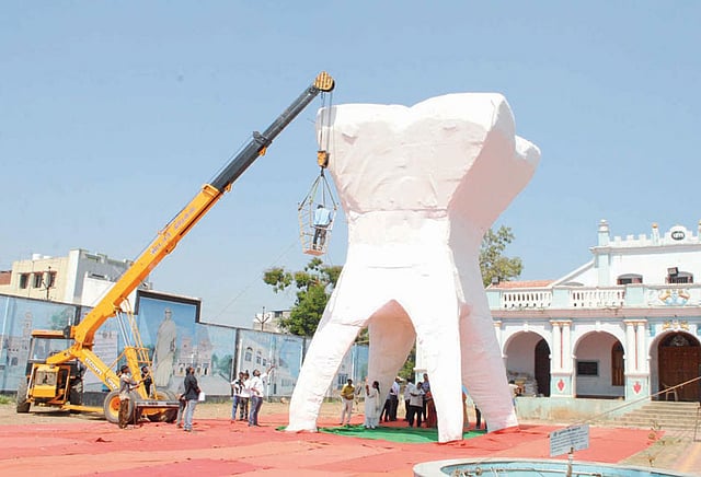நான் பல் மருத்துவர் என்பதால் உயரமான பல்லை உருவாக்க நினைத்தேன். எனவே அது குறித்து பல தகவல்களை சேகரித்தேன். அதில் நியூசிலாந்தில் சென்சோடைன் பேஸ்ட் கம்பெனி மூலம் 30 அடி உயர செயற்கை பல் உருவாக்கப்பட்டதை அறிந்தேன். எனவே அந்த சாதனையை முறியடிப்பதற்காக அதைவிட பெரிய பல்லை உருவாக்க நினைத்தேன்.
