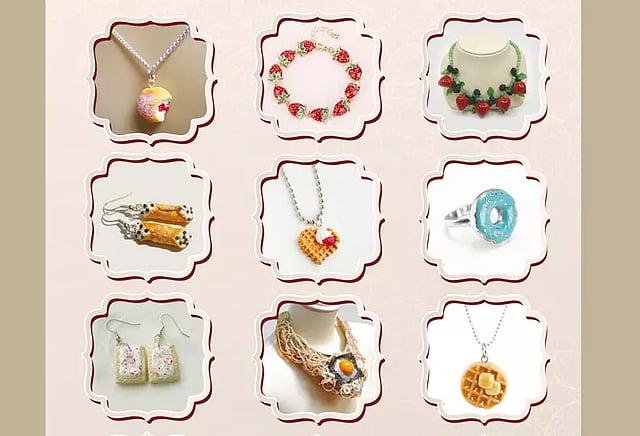 பாரம்பரிய நகைகள், நவீன நகைகள் என ஒவ்வொரு நாளும் விதவிதமான அணிகலன்கள் புது வரவாக வந்துகொண்டு இருக்கின்றன. இவற்றில் சற்றே வித்தியாசமான வடிவமைப்புடன் தயார் செய்யப்படும் நகைகள், சிறியவர் முதல் பெரியவர் வரை அனைவரின் கவனத்தையும் ஈர்க்கின்றன. அந்த வகையில் உணவை மையமாகக்கொண்டு வடிவமைக்கப்படும் புட் ஜூவல்லரி (உணவு அணிகலன்கள்) தற்போது டிரெண்டிங்கில் இருக்கிறது. பல்வேறு மூலப்பொருட்களைக் கொண்டு அச்சு அசலாக உணவு வகைகளை உணவு அணிகலன்களாக வடிவமைக்கிறார்கள். ஐஸ்கிரீம், ஆம்லெட், டோனட் என கண்களைக் கவரும் சில உணவு அணிகலன்களின் தொகுப்பு இதோ...