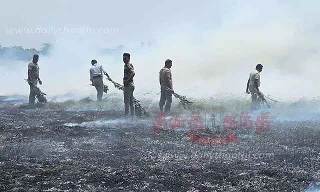 நேற்று நள்ளிரவு முதல் இன்று மதியம் வரை சுமார் 12 மணிநேரம் ஏற்பட்ட தீயில் 3 கிலோ மீட்டர் அளவில் புற்கள் மற்றும் மரம், செடிகள் எரிந்து நாசமாகி போயின. இந்த தீ விபத்தால் மரங்களில் கூடுகட்டி வசித்த உள்ளூர் மற்றும் வெளிநாட்டு பறவைகள் வெளியேறி விட்டன.