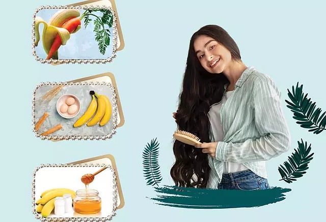 வாழைப்பழத்தில் ஏராளமான ஊட்டச்சத்துக்கள் உள்ளன. இதில் உள்ள 'சிலிகா' எனும் நுண்சத்து கொலாஜன் உற்பத்தியை அதிகரிக்கும். இதனால் கூந்தல் கருமையாகவும், அடர்த்தியாகவும், வலுவாகவும் மாறும். வாழைப்பழத்தில் இருக்கும் நுண்கிருமிகள் எதிர்ப்பு பண்பு, பாக்டீரியா மற்றும் பூஞ்சை பாதிப்பை நீக்கி பொடுகு பிரச்சினையை தீர்க்கும்.