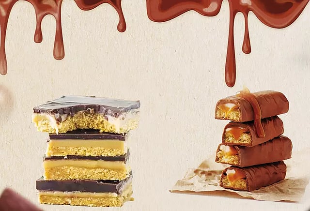 ஒரு செவ்வக வடிவப் பாத்திரத்தின் உள்ளே பட்டர் பேப்பரை வைக்கவும். அதன் மீது உருக்கி வைத்துள்ள ஒரு பங்கு மில்க் சாக்லெட்டை பரவலாக ஊற்றவும். அதற்கு மேல் கேரமல்லை ஊற்றி தடவவும். பின்பு மீண்டும் அதன் மேல் மற்றொரு பங்கு மில்க் சாக்லெட்டை ஊற்றி பரப்பி விடவும்.