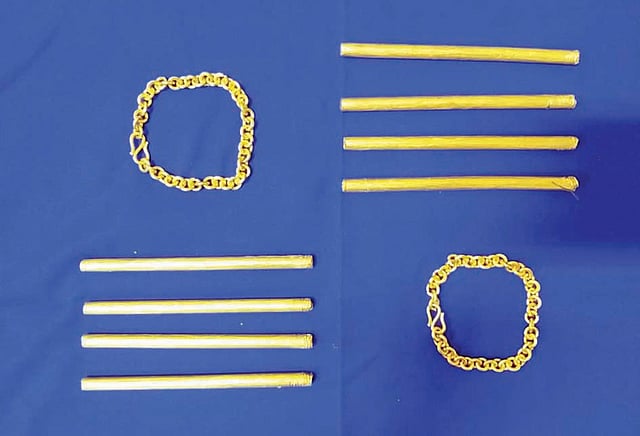 அதில் உருளை வடிவில் தங்கத்தை மறைத்து வைத்து கடத்தி வந்ததை கண்டுபிடித்தனர். மேலும் 2 தங்க பிரேஸ்லெட்டுகளும் மறைத்து வைத்து இருப்பது தெரிந்தது.