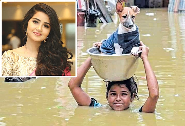 அந்த படத்தை தனது டுவிட்டர் பக்கத்திலும் வெளியிட்டு இருக்கிறார். புகைப்படத்தில் ஒரு சிறுமி கழுத்தளவு வெள்ளத்தில் நடந்து செல்கிறார். அவரது தலையில் உள்ள பாத்திரத்தில் ஒரு நாய்க்குட்டி இருக்கிறது.