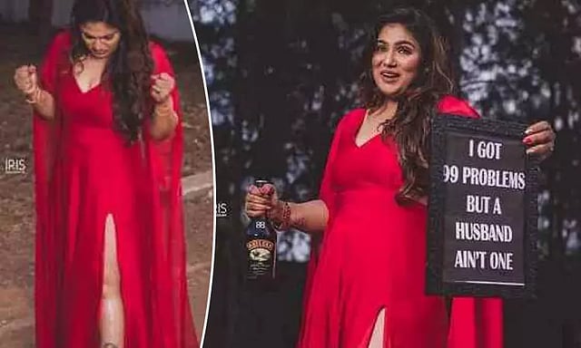 போட்டோ ஷூட்டில் திருமணம் ஆன புதிதில் ரியாஸுடன் எடுத்துக்கொண்ட புகைப்படத்தை கிழிப்பது போலவும், கணவரின் புகைப்படத்தை காலில் போட்டு மிதிப்பது போலவும் போஸ் கொடுத்திருக்கிறார். அதுமட்டுமின்றி கையில் ஒரு கறுப்பு பலகையை ஏந்தியிருக்கிறார். அந்த பலகையில், எனக்கு 99 பிரச்னைகள் இருக்கின்றன. ஆனால் கணவர் இல்லை என எழுதப்பட்டு உள்ளது.