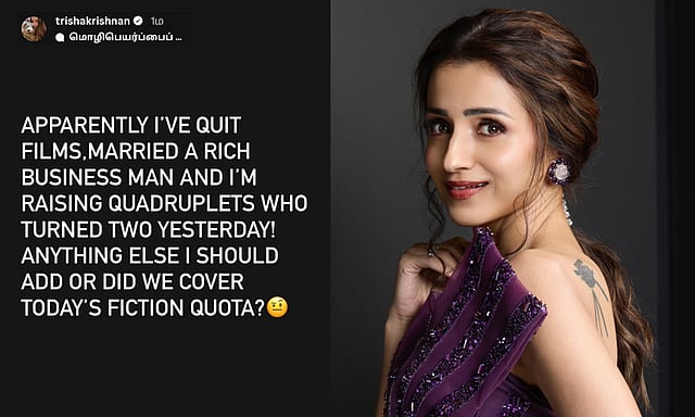 இந்த நிலையில் இதுதொடர்பாக மவுனம் கலைத்துள்ள திரிஷா தனது இன்ஸ்டாகிராம் ஸ்டோரியில் அதற்கு பதிலளித்துள்ளார். அந்தப் பதிவில் அவர், "நான் சினிமாவை விட்டு விலகிவிட்டேன். ஒரு பணக்கார தொழிலதிபரை திருமணம் செய்துகொண்டேன். ஒரே பிரசவத்தில் பிறந்த 4 குழந்தைகளை வளர்த்து வருகிறேன். அவர்களுக்கு நேற்றுதான் இரண்டு வயதானது. இன்னும் வேறு ஏதாவது நான் சேர்க்க வேண்டுமா? அல்லது இன்றைய கற்பனை கதைக்கான கோட்டாவை பூர்த்தி செய்துவிட்டோமா?" என்று கிண்டலாக அதே நேரத்தில் காட்டமாக பதிவிட்டுள்ளார்.