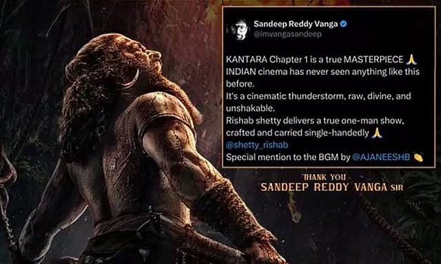 இந்த நிலையில், 'ஸ்பிரிட்' பட இயக்குனர் சந்தீப் ரெட்டி வங்கா "காந்தாரா சாப்டர் 1" படத்தை பாராட்டி தனது சமூக வலைத்தள பக்கத்தில் பதிவிட்டுள்ளார். அதில், "காந்தாரா சாப்டர் 1 உண்மையான மாஸ்டர்பீஸ். இந்திய சினிமா இதுவரை கண்டிராத ஒன்று. சினிமாட்டிக் உடன் கூடிய இடி மின்னல் மழை, கரடுமுரடான, தெய்வீகம் மற்றும் அசைக்கமுடியாதது. ரிஷப் ஷெட்டி தனியாளாக உருவாக்கி படத்தை தூக்கி நிறுத்தியுள்ளார். பின்னணி இசைக்காக இசையமைப்பாளர் அஜ்னீஷ்க்கு சிறப்பு பாராட்டுகள்" எனக் கூறியுள்ளார்.