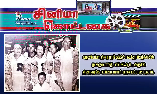 திரையரங்கத்தில் திரையின் முன்பு கருணாநிதி, எம்.ஜி.ஆர். ஒரே மேடையில் தோன்றி கட்சித் தொண்டர்களை உற்சாகப்படுத்தி இருக்கிறார்கள். அப்போது திரையரங்கத்தின் உரிமையாளர் பழனியப்பா செட்டியாரும் கட்சி நிர்வாகிகளும் உடன் இருந்திருக்கிறார்கள். அவர்களுக்கு மாலைகள் அணிவித்து கவுரவித்து இருக்கிறார்கள். இந்த நிகழ்வானது கடந்த 1960-ம் ஆண்டு மே மாதம் 9-ந் தேதி நடந்துள்ளது. இந்த அரிய புகைப்படம் பழனியப்ப செட்டியாரின் பேரன் வழியான எஸ்.பி.பழனியப்பன் வீட்டில் அலங்கரித்து கொண்டிருக்கிறது. கருணாநிதியும், எம்.ஜி.ஆரும் இணைந்து புதுக்கோட்டையில் பங்கேற்ற நிகழ்ச்சிகளில் இது முக்கியவத்துவம் வாய்ந்ததாகவும் கருதப்படுகிறது. இருவரும் இணைந்து புதுக்கோட்டையில் பங்கேற்ற நிகழ்வு இது ஒன்றாகத்தான் இருக்கக்கூடும் எனவும் அறியப்படுகிறது.