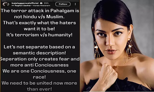 இந்நிலையில் காஜல் அகர்வால் தனது இன்ஸ்டாகிராம் ஸ்டோரியில், "பஹல்காமில் நடந்த பயங்கரவாத தாக்குதல் இந்து - முஸ்லீம் இடையேயான பிரச்னை கிடையாது. ஆனால் அதைத்தான் வெறுப்பாளர்கள் விரும்புகிறார்கள். அங்கு நடந்தது பயங்கரவாதத்துக்கும் மனிதநேயத்துக்குமான மோதல். ஒரு பெயரின் அடிப்படையில் யாரையும் பிரிக்க வேண்டாம். பிரிவினை எப்போதும் பயத்தையும் அதிக எதிர்ப்பு உணர்வையும் மட்டுமே உருவாக்கும். ஆனால் நாம் ஒரே இனம் என்ற உணர்வு இருக்க வேண்டும். நாம் எப்போதும் இல்லாத அளவுக்கு இப்போது ஒன்று பட வேண்டும்" எனக் குறிப்பிட்டுள்ளார்.