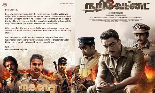 இதுகுறித்து, அந்நிறுவனத்தின் இன்ஸ்டாகிராம் பக்கத்தில் "அன்பான நேயர்களே, 'நரிவேட்டை' திரைப்படம் மீண்டும் தணிக்கைச் செய்யப்பட்டு காட்சிகள் நீக்கப்பட்டுள்ளதாக சில ஊடகங்களில் செய்திகள் வெளியாகியுள்ளன. அப்படி எந்தவொரு காட்சிகளும் நீக்கப்படவில்லை என்பதை நாங்கள் தெளிவுப்படுத்த விரும்புகிறோம். பிரபல ராப் பாடகர் வேடனின் 'வாடா வேடா' பாடல் மட்டுமே தணிக்கைச் செய்யப்பட்டு படத்தில் இணைக்கப்பட்டுள்ளது" எனக் கூறப்பட்டுள்ளது.மேலும், இப்படம் வெளியான நாளன்று இருந்தக் காட்சிகள் அனைத்தும் தற்போதும் உள்ளது எனவும், ஊடகங்கள் மற்றும் சினிமா பிரியர்கள் எந்தவொரு தவறான தகவல்களையும் பரப்ப வேண்டாமெனவும் அந்நிறுவனம் கேட்டுக்கொண்டுள்ளது.