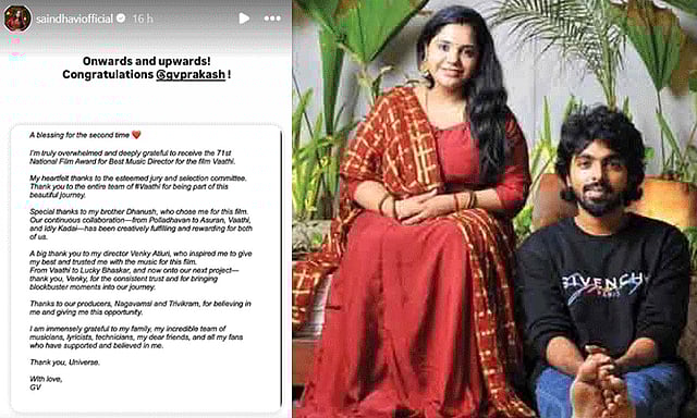இந்த நிலையில், 2வது தேசிய விருது பெறும் நடிகரும், இசையமைப்பாளருமான ஜி.வி.பிரகாசுக்கு திரைப்பிரபலங்கள் பலரும் வாழ்த்து தெரிவித்து வருகின்றனர். அந்த வகையில், பாடகி சைந்தவி ஜி.வி.பிரகாசுக்கு தனது சமூக வலைத்தள பக்கத்தில் வாழ்த்த தெரிவித்துள்ளார்.
