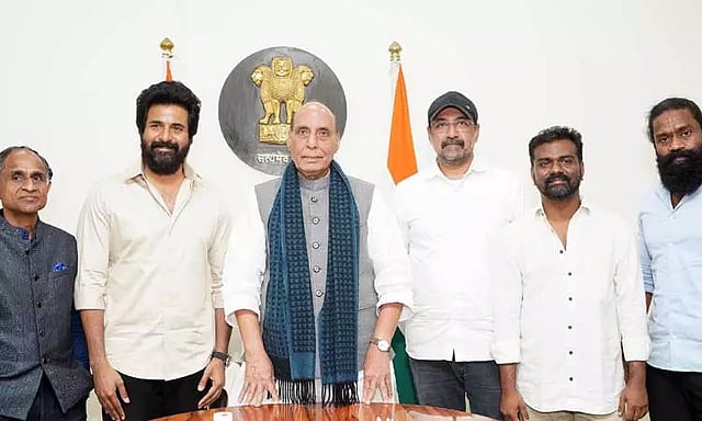 இந்த நிலையில், 'அமரன்' படக்குழுவுக்கு மத்திய பாதுகாப்புத்துறை மந்திரி ராஜ்நாத் சிங் வாழ்த்து தெரிவித்துள்ளார் . நடிகர் சிவகார்த்திகேயன், இயக்குநர் ராஜ்குமார் பெரியசாமி உள்ளிட்டோரை சந்தித்து ராஜ்நாத் சிங் வாழ்த்து தெரிவித்துள்ளார்.