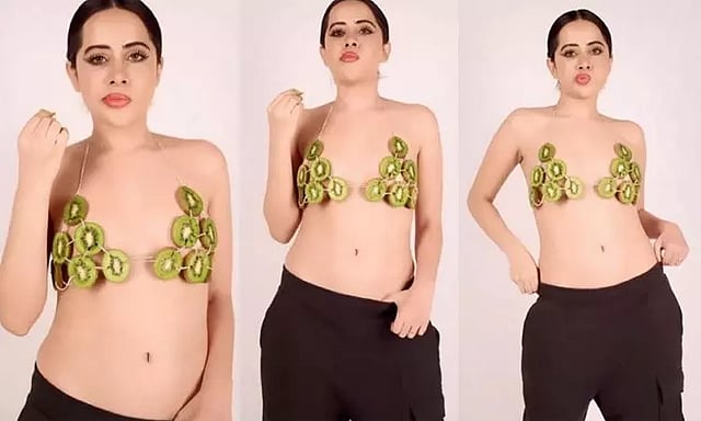 உர்பி ஜாவேத் மிகவும் விலையுயர்ந்த பழங்களில் ஒன்றான கிவி பழத்தை சாப்பிட்டு கொண்டே. அதே பழத்தாலான மேலாடையை அணிந்து கேமராவுக்கு போஸ் கொடுத்தார்.