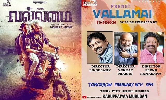 வல்லமை படத்தின் டீசரை இயக்குனர்கள் வெங்கட் பிரபு, லிங்குசாமி, சீனு ராமசாமி ஆகியோர் இணைந்து வெளியிட உள்ளனர். கருப்பையா முருகன் இயக்கத்தில் பிரேம்ஜி நடிக்கும் "வல்லமை" படத்தின் டீசர் இன்று மாலை 5 மணிக்கு வெளியாகுமென படக்குழு அறிவித்துள்ளது.