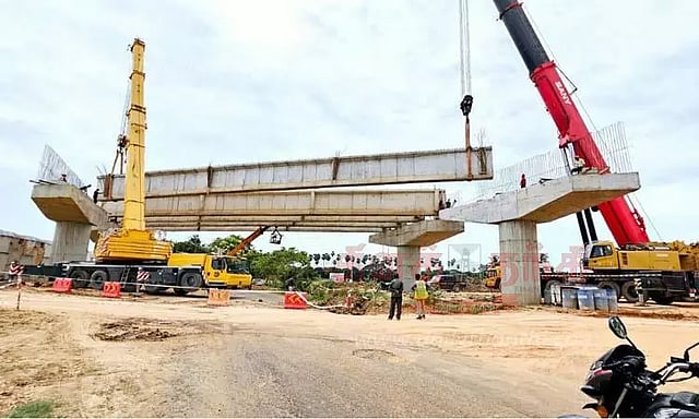 விழுப்புரம்-புதுச்சேரி-நாகப்பட்டினம் தேசிய நெடுஞ்சாலை ரூ.6 ஆயிரத்து 431 கோடி செலவில் 4 வழிச்சாலையாக அமைக்கும் பணி தீவிரமாக நடந்து வருகிறது. இதன் ஒரு பகுதியாக பாகூர்-கன்னியக் கோவில் சாலை இடையே மேம்பாலம் அமைக்கும் பணி நடந்து வருகிறது. இதற்காக 3 ராட்சத கிரேன் மற்றும் லாரிகள் மூலம் கான்கிரீட் தடுப்புகள் எடுத்து வரப்பட்டு மேம்பாலத்தில் பொருத்தப்பட்டு பணிகள் நடந்து வருகிறது.