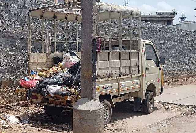 பழுதடைந்து நிற்கும் வாகனத்தில் கொட்டப்படும் குப்பை