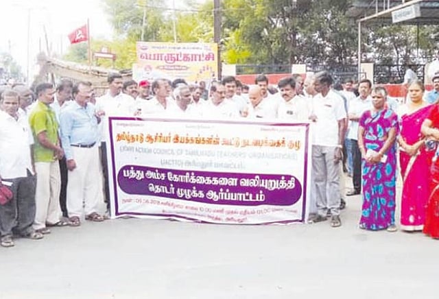 புதிய ஓய்வூதிய திட்டத்தினை ரத்து செய்து விட்டு பழைய ஓய்வூதிய திட்டத்தை அரசு நடைமுறைப்படுத்த வேண்டும். 7-வது ஊதியக்குழு அறிவித்த ஊதிய உயர்வில் 21 மாத நிலுவை தொகையினை உடனடியாக தமிழக அரசு வழங்கிட வேண்டும். 7-வது ஊதியக்குழு முரண்பாடுகளை களைந்திட அமைக்கப்பட்டுள்ள ஒரு நபர் குழு, ஆசிரியர் இயக்கங்களை அழைத்து கலந்துரையாடல் செய்ய வேண்டும். கல்வித்துறையை குழப்பத்தில் ஆக்கும் தமிழக அரசு வெளியிட்டுள்ள அரசாணைகள் 56, 100, 101 ஆகியவற்றை ரத்து செய்ய வேண்டும். பள்ளிக்கல்வி துறையில் ஆட்குறைப்பு என்ற அடிப்படையில் பணிநிரவல் மூலம் ஆசிரியர்களை பணிமாறுதல் செய்வதை கைவிட வேண்டும்.