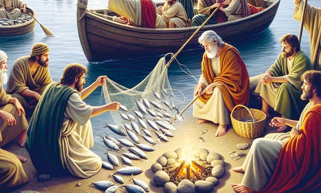 இயேசு அவர்களை நோக்கி, “உங்கள் படகின் வலப்புறம் வலையைப் போடுங்கள், மீன் கிடைக்கும்" என்று கூறினார். அவர்கள் கீழ்ப்படிந்தபோது, வலை நிறைய 153 பெரிய மீன்களைப் பிடித்தார்கள்.