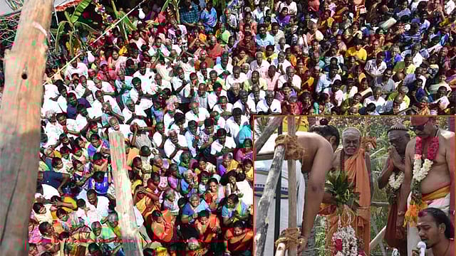 யாகசாலை பூஜைகள் நிறைவடைந்ததையடுத்து நேற்று காலை 11.20 மணியளவில கோபுர கலசங்களுக்கு புனித நீர் ஊற்றி மகா கும்பாபிஷேகம் நடைபெற்றது. அப்போது கருடன் வானத்தில் வட்டமிட்டது. தொடர்ந்து பக்தர்கள் மீது புனித நீர் தெளிக்கப்பட்டது. தொடர்ந்து தீபாராதனை காட்டப்பட்டு பக்தர்களுக்கு பிரசாதம் வழங்கப்பட்டது.