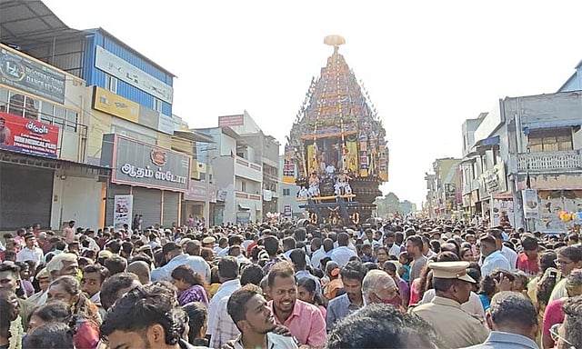 காலையிலேயே அலங்கரித்து வைக்கப்பட்டிருந்த தேரில் திருநாகேஸ்வரர் எழுந்தருளி பக்தர்களுக்கு காட்சியளித்தார். அதன்பின்னர் அமைச்சர் தா.மோ. அன்பரசன், எம்.எல். ஏ. செல்வப்பெருந்தகை தேரின் வடம் பிடித்து இழுத்து தேரோட்டத்தை தொடங்கி வைத்தனர். இதில் ஏராளமான பக்தர்கள் கலந்துகொண்டு தேர் இழுத்தனர். கோவிலின் முக்கிய மாட வீதிகள் வழியாக தேர் ஊர்வலமாக சென்றது.